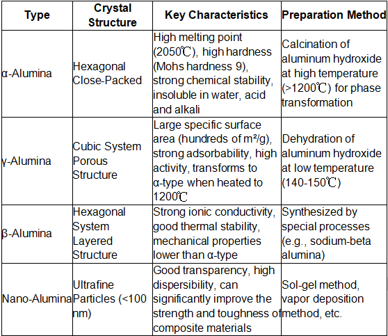 అల్యూమినా పౌడర్ యొక్క ప్రధాన వర్గీకరణ దాని క్రిస్టల్ నిర్మాణం మరియు తయారీ ప్రక్రియపై ఆధారపడి ఉంటుంది. సాధారణ రకాలు మరియు వాటి లక్షణాలు క్రింది విధంగా ఉన్నాయి: